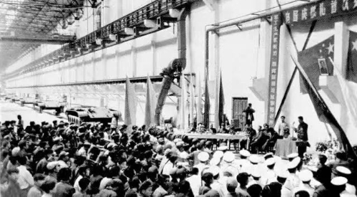 1959年8月22日,凝結(jié)著干部職工心血和汗水的32輛59式坦克,比建廠時計劃進度提前一年交付部隊,經(jīng)過嚴格考核試驗后參加了建國十周年國慶大閱兵。