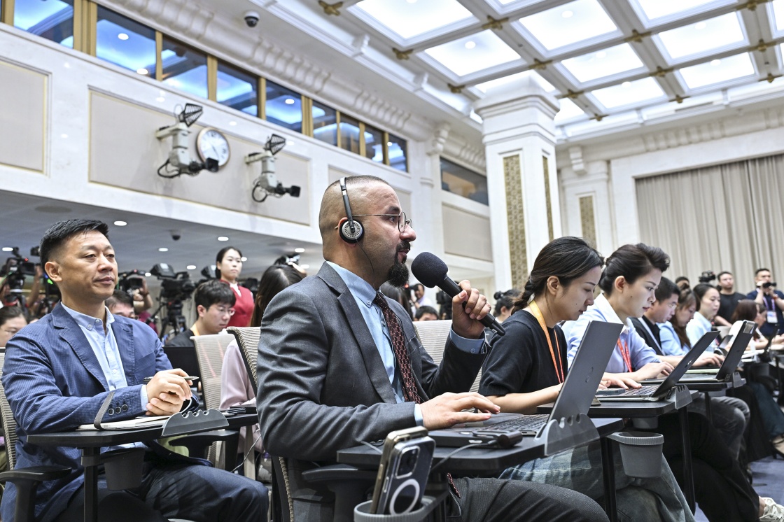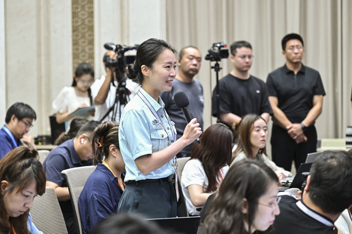8月20日,國務院新聞辦公室在北京舉行新聞發(fā)布會,閱兵領導小組辦公室副主任、中央軍委聯合參謀部作戰(zhàn)局少將副局長吳澤棵,中國人民解放軍中部戰(zhàn)區(qū)閱兵指揮機構辦公室常務副主任、政治工作部少將副主任徐貴忠介紹閱兵準備工作有關情況,并答記者問。這是記者在現場提問。